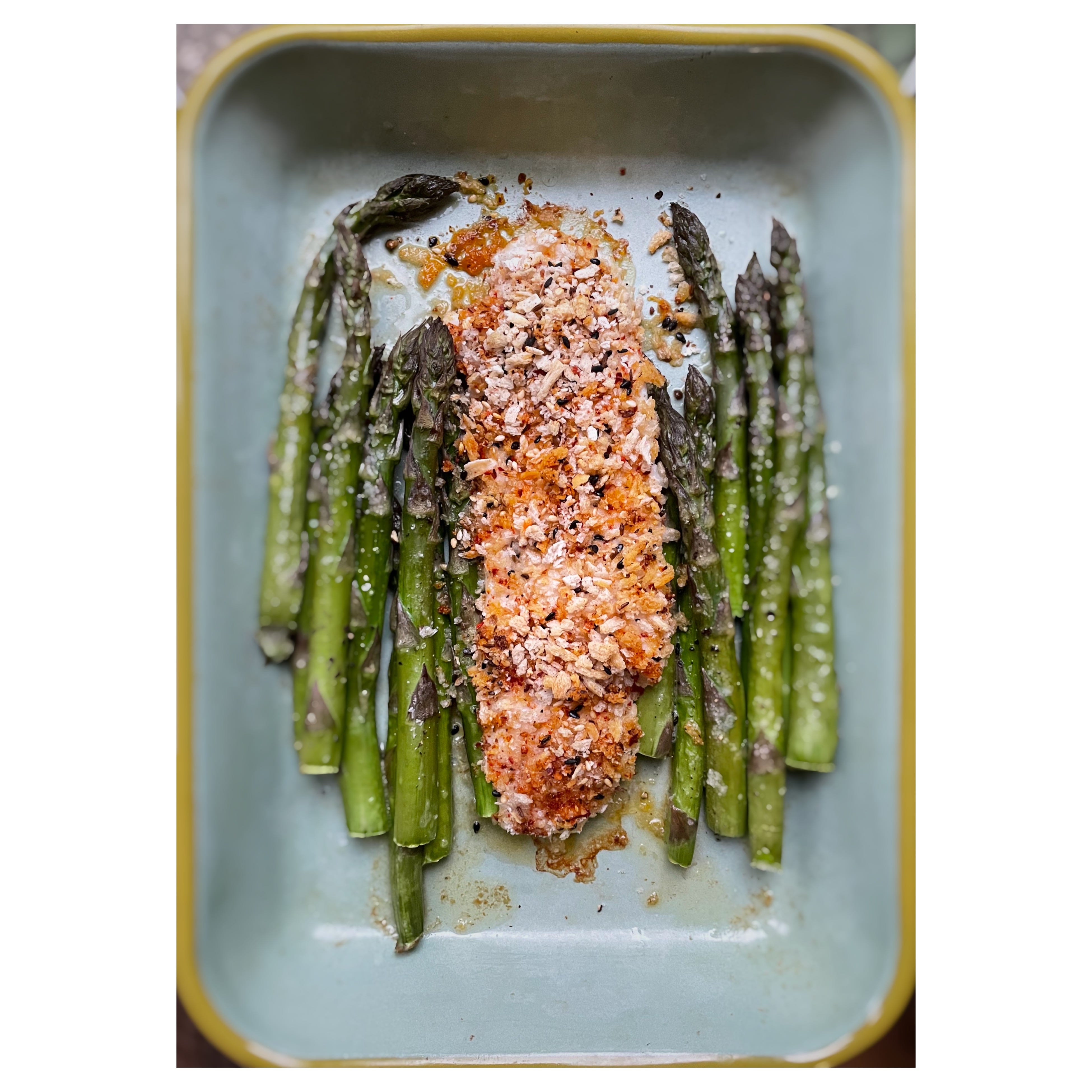 Baked Cod with a Butter & Chilli Salt Breadcrumb Coating & Asparagus