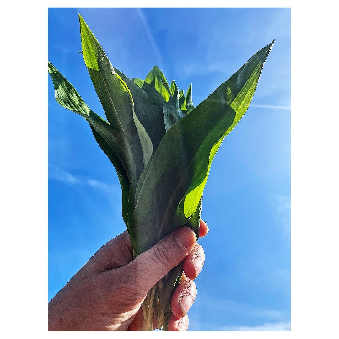 On my way home from the kitchen earlier I stopped at a faithful patch of wild garlic, hoping to pick a few of the pungent leaves to use for dinner this evening. Nature did not disappoint and the patch is already hearty with leaves ready for the picking. As counselled by Robin Wall Kimmerer in her book Braiding Sweetgrass, I always ask permission of a plant before harvesting and love the way that this practice enhances engagement. This morning I asked after the garlic’s experience of winter while I took one leaf from each discernible bunch like plant in the ground, taking a total of 20 leaves, plenty for my needs.