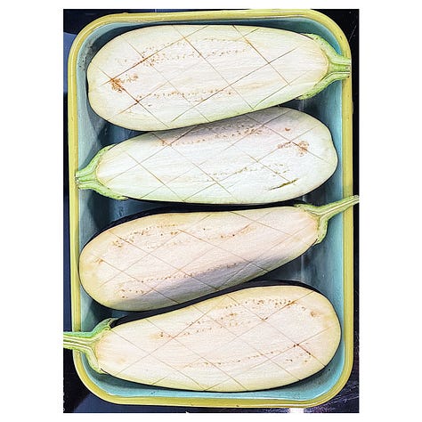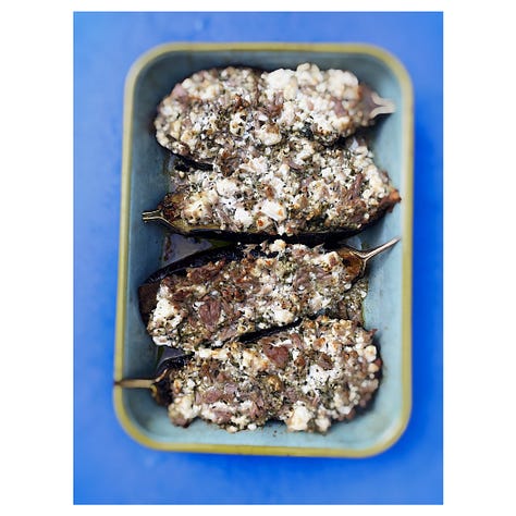 The recipe this week is a homage to aubergine – I love simply cutting them in half down their length, with the stalk still attached, cross cross scoring the flesh with a sharp knife before brushing them with extra virgin olive oil, salt and pepper and roasting them for 20 minutes at 190c or 170c fan. Once they are cooked you can top them with any number of things before returning them to the oven for a further 10 minutes and serving them with the salad of your choice. They are also delicious cold for lunch the next day.